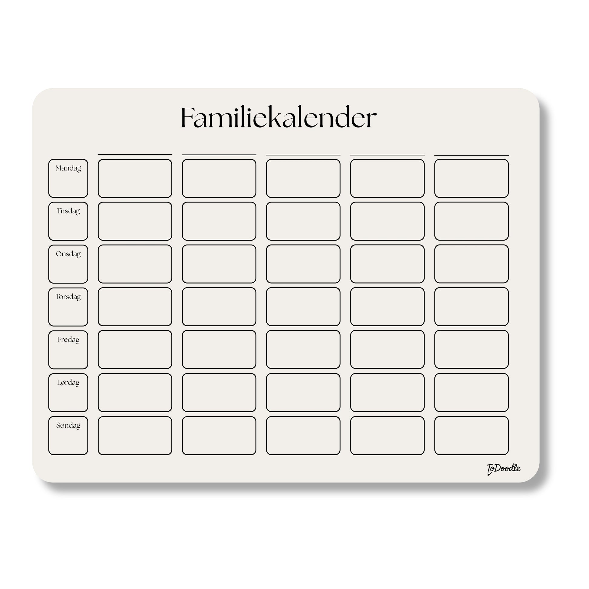 ToDoodle™ Familiekalenderen er skabt til familier, der ønsker et roligt, overskueligt og visuelt overblik over hverdagen. Den store skrivetavle gør det nemt at koordinere aftaler, aktiviteter, madplaner og gøremål – uden rod og uden papirspild.